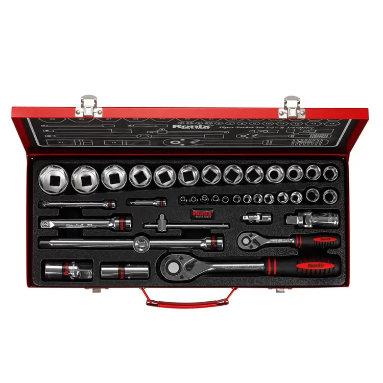 11 عدد سوکت 1/4 اینچی 4, 4.5, 5, 5.5, 6, 7, 8, 9, 10, 11, 12 ) میلی متر 15 عدد درایو 1/2 اینچ ( 13, 14, 15, 16, 17, 18, 19, 20, 21, 22, 23, 24, 27, 30, 32) میلی متر 2 عدد دسته افزایشی درایو 1/4 اینچی، سری 2 , 4 اینچ- 2 عدد دسته جغجغه ایی 1/2 و 1/4 اینچ 72 دندانه ایی 2 عدد اتصال دهنده یونیورسال 1/2 و 1/4 اینچی- 1 عدد دستگیره T شکل کشویی 1/4 اینچی- 1 عدد تبدیل 1/2 اینچ نری به 3/8 اینچ مادگی- |